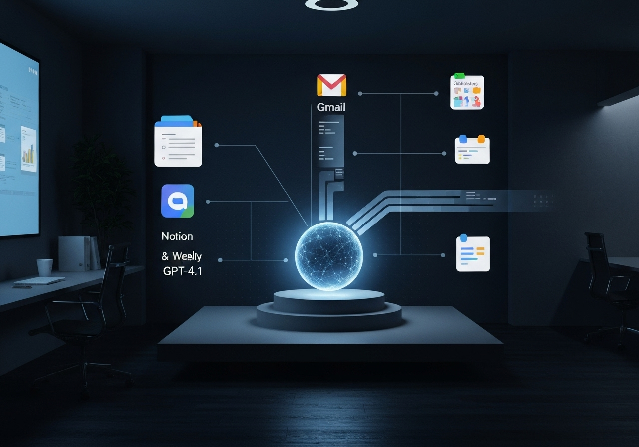 Агент создает еженедельный отчет по OKR, интегрируя данные из Gmail, Google Calendar и Notion с использованием технологии GPT-4.1 для анализа и генерации отчетов. Он автоматически собирает информацию о действиях за прошлую неделю, включая электронные письма, события в календаре и цели в Notion, и формирует отчет о прогрессе, проблемах и следующих шагах.