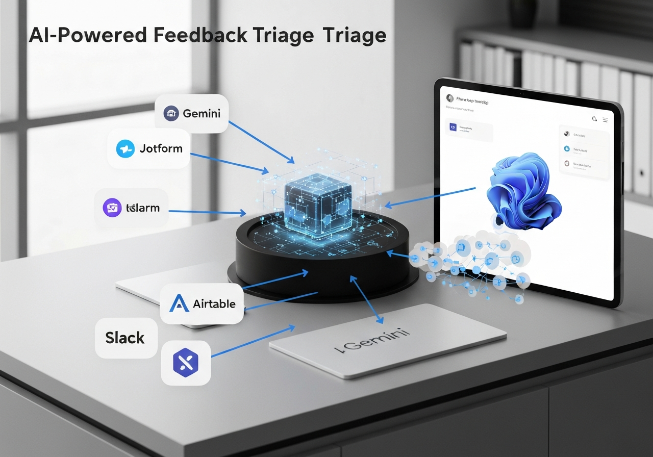 AI-Powered Feedback Triage использует Jotform для сбора отзывов от клиентов и сотрудников, анализирует их с помощью AI Gemini и направляет в Trello для создания задач, в Airtable для структурированной записи и в Slack для уведомлений о срочных ошибках.