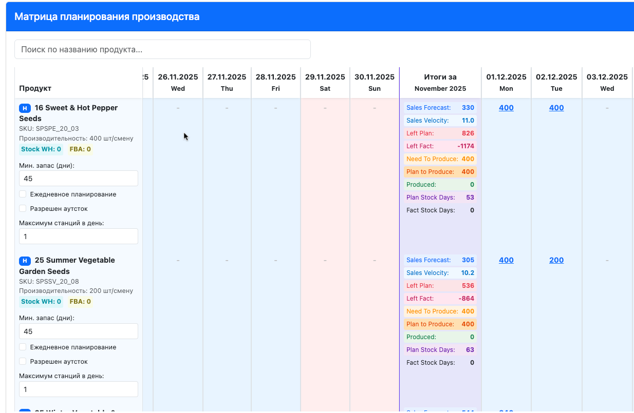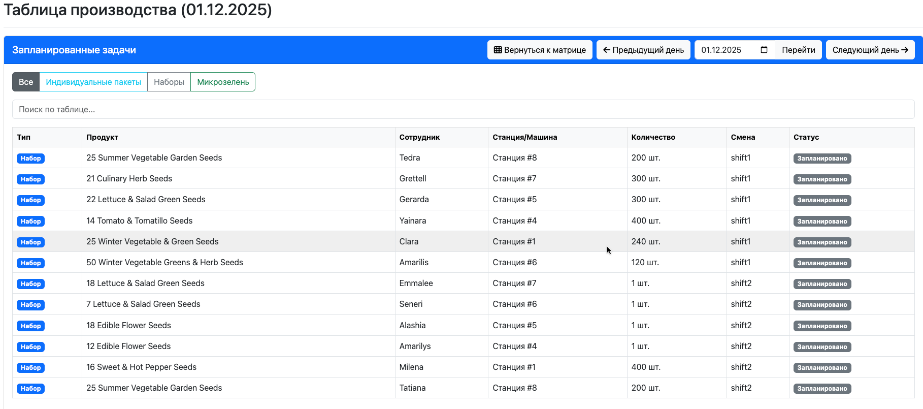 Матрица планирования - мощный инструмент визуализации, который позволяет видеть всю картину планирования в одном месте. Структура матрицы: строки представляют все продукты (наборы, микрозелень, индивидуальные пакеты) с их характеристиками, колонки - смены по датам, что позволяет видеть распределение производства во времени, ячейки содержат количество запланированного производства с цветовой индикацией приоритетов.