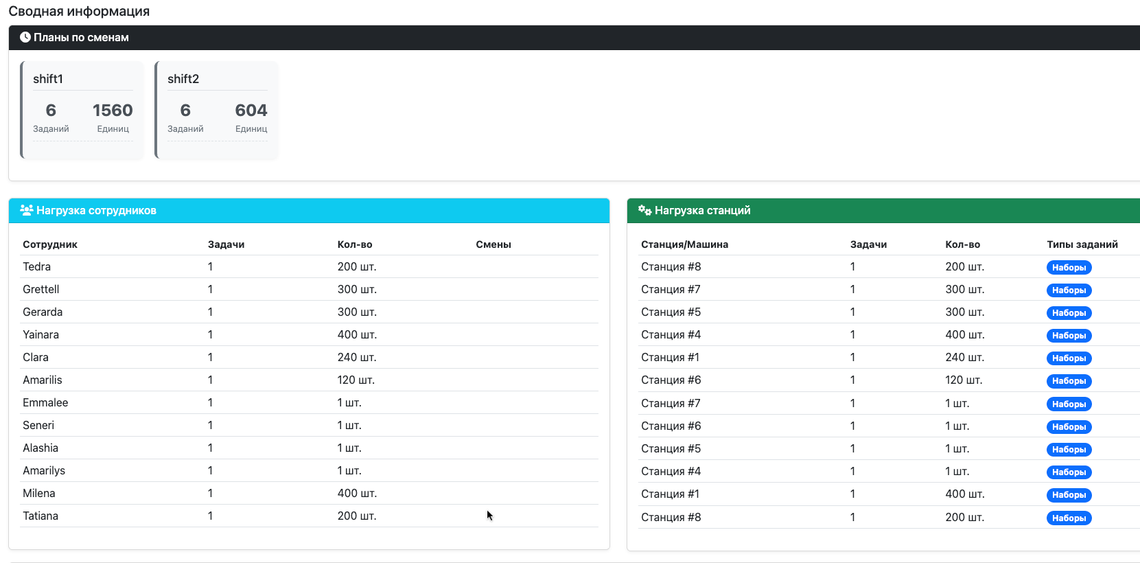 - Создание плана - система создает детальный план на день с указанием продуктов для производства, станций и машин, назначенных сотрудников, смен и планируемого количества продукции.