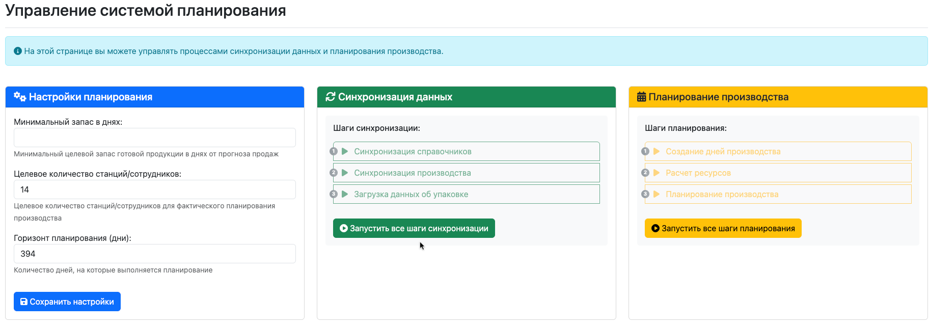 Система интегрируется с внешними системами для получения актуальных данных. Все интеграции работают автоматически, обеспечивая актуальность данных для планирования.