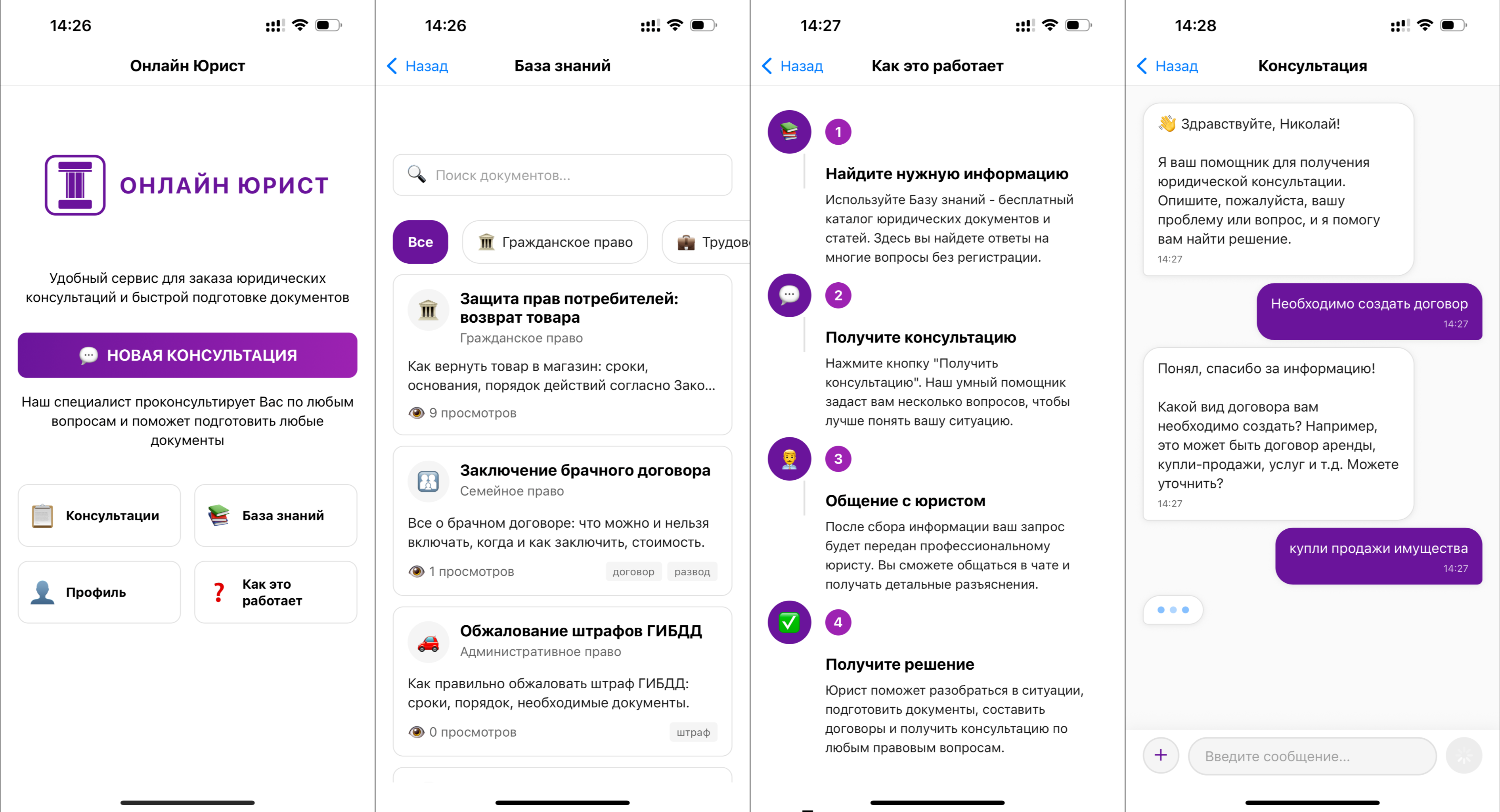 Приложение состоит из нескольких ключевых экранов, каждый из которых решает конкретную задачу. Главный экран предлагает быстрое создание новой консультации и доступ к основным функциям. Экран чата обеспечивает общение с AI-ассистентом и юристом, автоматически обновляя сообщения. База знаний позволяет искать и читать юридические статьи. Экран профиля отображает историю консультаций и настройки пользователя.