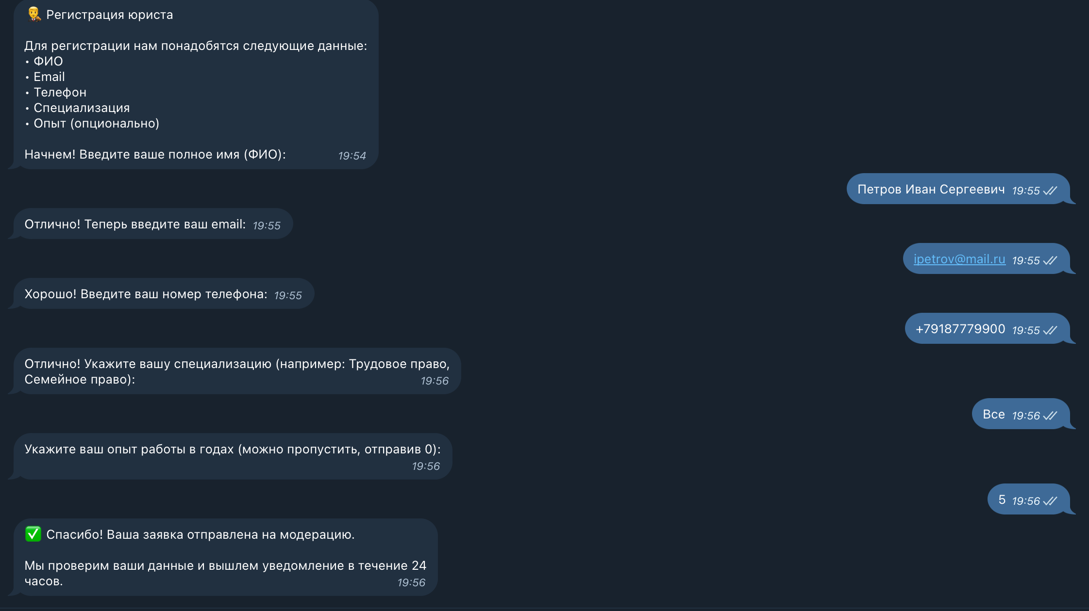 Процесс регистрации юриста максимально упрощен: админ создает пользователя в Django Admin с типом "lawyer", юрист получает приглашение, переходит по ссылке и вводит команду /start. Бот собирает дополнительную информацию (специализация, опыт), и юрист готов получать заявки.