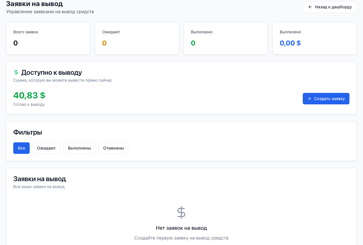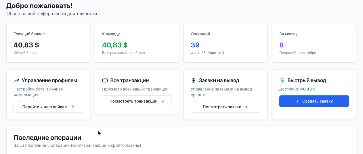 Проблема: Партнеры не видят свою статистику, баланс и историю операций в реальном времени. Приходится постоянно обращаться к администраторам за информацией.